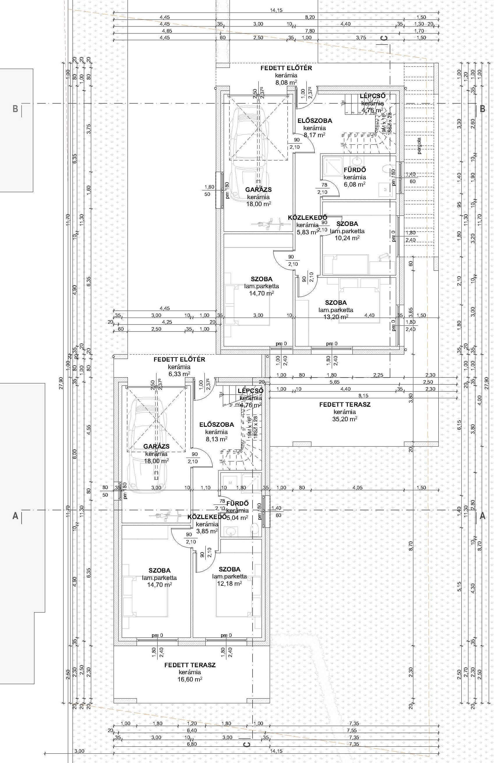 Előszoba (8,13 m2), Lépcső (4,76 m2), Fürdőszoba (5,04 m2), Közlekedő (3,85 m2), 1. Hálószoba (12,18 m2), 2. Hálószoba (14,70 m2), Garázs (18.00 m2).