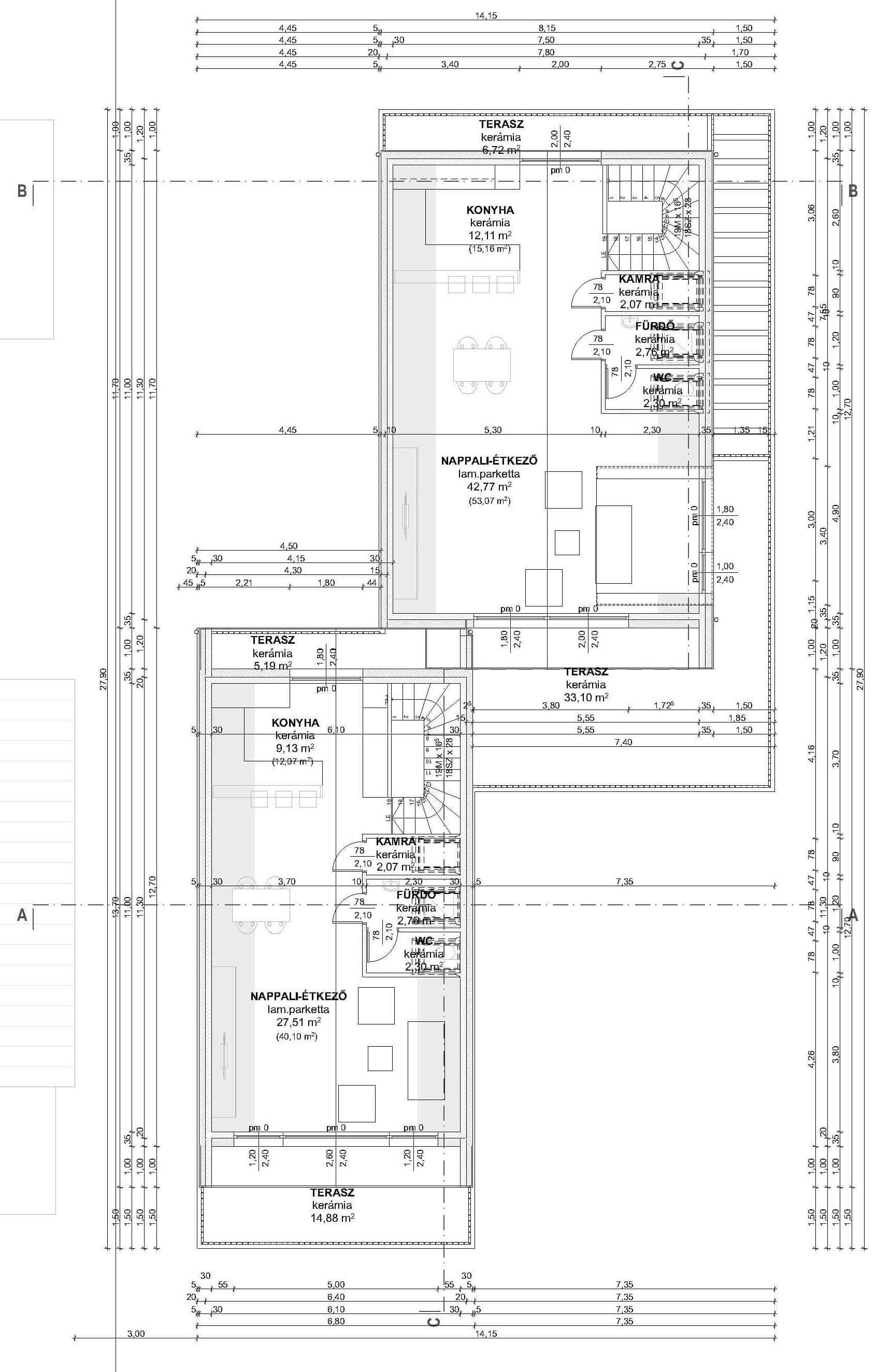 Nettó alapterület összesen: 156,34 m2 + fedett előtér és terasz 43,28 m2.