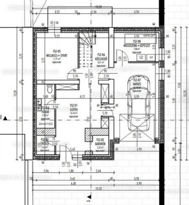 A földszinti (garázs szint) alaprajza, amin látható a bejárat, előtér, garázs, sportszoba, mosószoba+gépészet, gardrób és egy tároló.