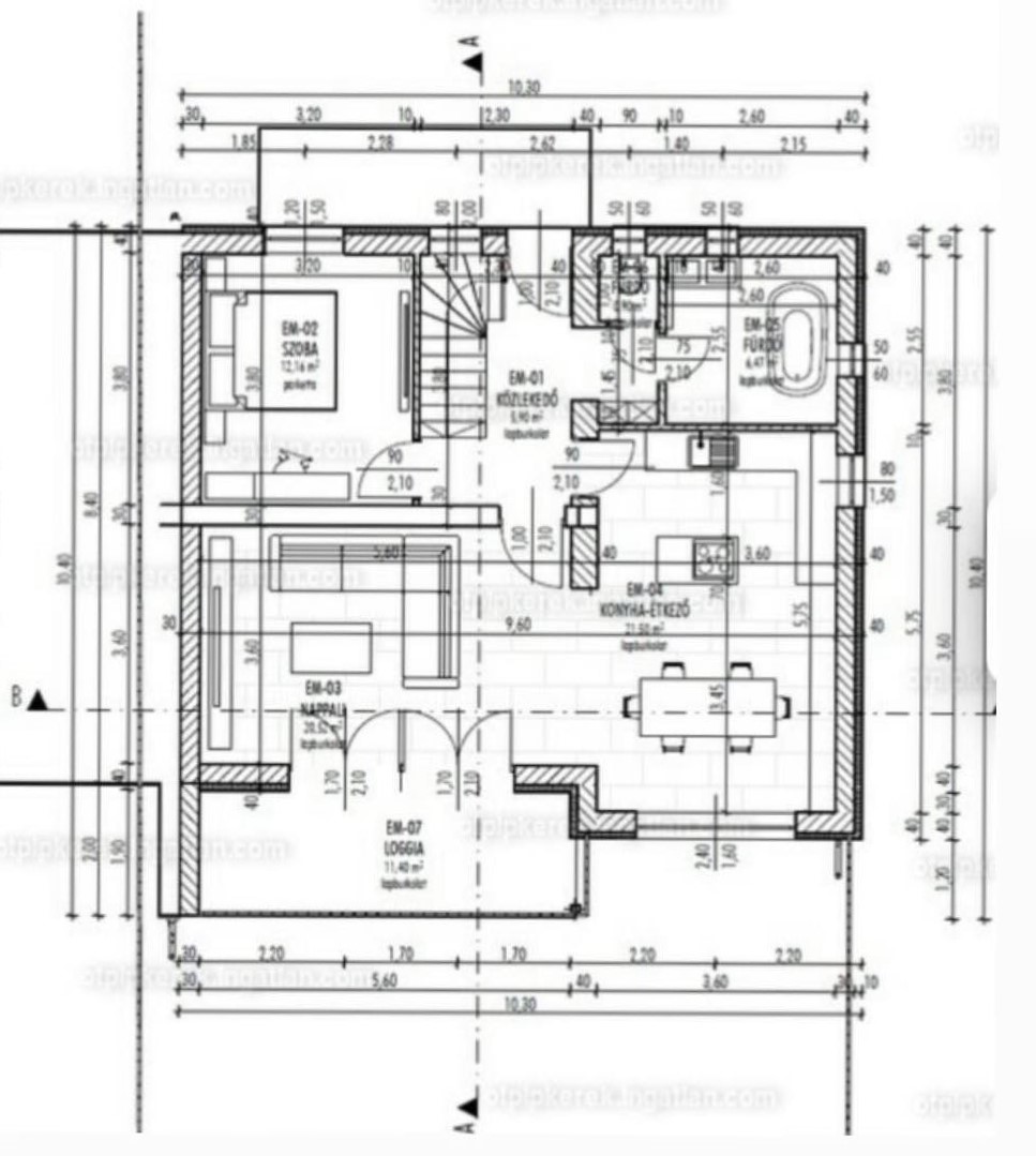 Az első emeleti alaprajz, amin látható a konyha+étkező, nappali, közlekedő, fürdőszoba, hálószoba és loggia.