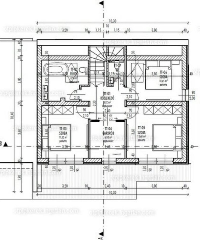 Tetőtéri szinten 3 hálószoba, és fürdőszoba van, gardrób társaságában.